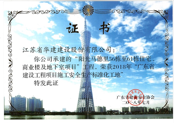 陽光馬德里獲2018年廣東省建設(shè)工程項(xiàng)目安全生產(chǎn)生產(chǎn)標(biāo)準(zhǔn)化工地