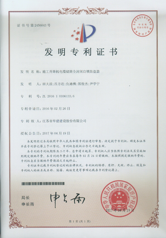 我公司又獲得一項國家發明專利授權 時間:2017-06-02 3962 日前,公司又一項發明專利獲得國家知識產權局授權,此項專利名稱為“施工升降機電纜儲筒全封閉自鎖防盜器”,專利號為ZL 2016 1 0106133.6。 至此,公司已有22項發明專利入賬。