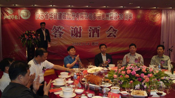 11月4日,公司在惠州凱賓斯基酒店王子飯店隆重召開參加惠州建設(shè)20周年慶典暨答謝酒會,公司副董事長、總經(jīng)理宗有農(nóng)主持酒會并作開場致辭。惠州市有關(guān)政府部門、部分合作方企業(yè)的負責人,華建聯(lián)盟成員單位負責人,公司董事、監(jiān)事和高管等130余人出席慶典。惠州公司總經(jīng)理華恒榮介紹了公司參加惠州建設(shè)20年的有關(guān)情況。惠州市工商聯(lián)主席、公司戰(zhàn)略合作伙伴恒宇實業(yè)集團公司董事長楊滿芳代表合作方發(fā)言,惠州市住房和城鄉(xiāng)規(guī)劃建設(shè)局副局長陳訓政代表政府主管部門致辭,分別對江蘇華建進駐惠州施工、參加惠州建設(shè)20周年表示祝賀。公司董事長陸金龍代表公司總部對惠州市有關(guān)政府部門、相關(guān)合作方和社會各界人士給予公司的關(guān)心和支持表示誠摯的感謝,并表達了進一步加大支持力度、加強戰(zhàn)略合作、加快科學發(fā)展的意愿。