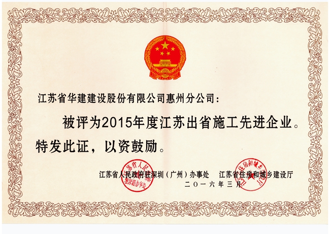 惠州公司榮獲“2015年度江蘇出省施工先進企業”稱號 時間:2016-03-26 2892 3月24日,江蘇省人民政府駐深圳(廣州)辦事處和江蘇省住房和城鄉建設廳在南寧召開2016年江蘇建筑業南方區工作會議,表彰了一批施工先進企業、優秀企業經理、優秀建造師和先進個人。惠州公司獲評“2015年度江蘇出省施工先進企業”,總經理華恒榮被評為優秀企業經理,陳申高被表彰為質量安全先進個人,楊猛被表彰為經營財務先進個人。