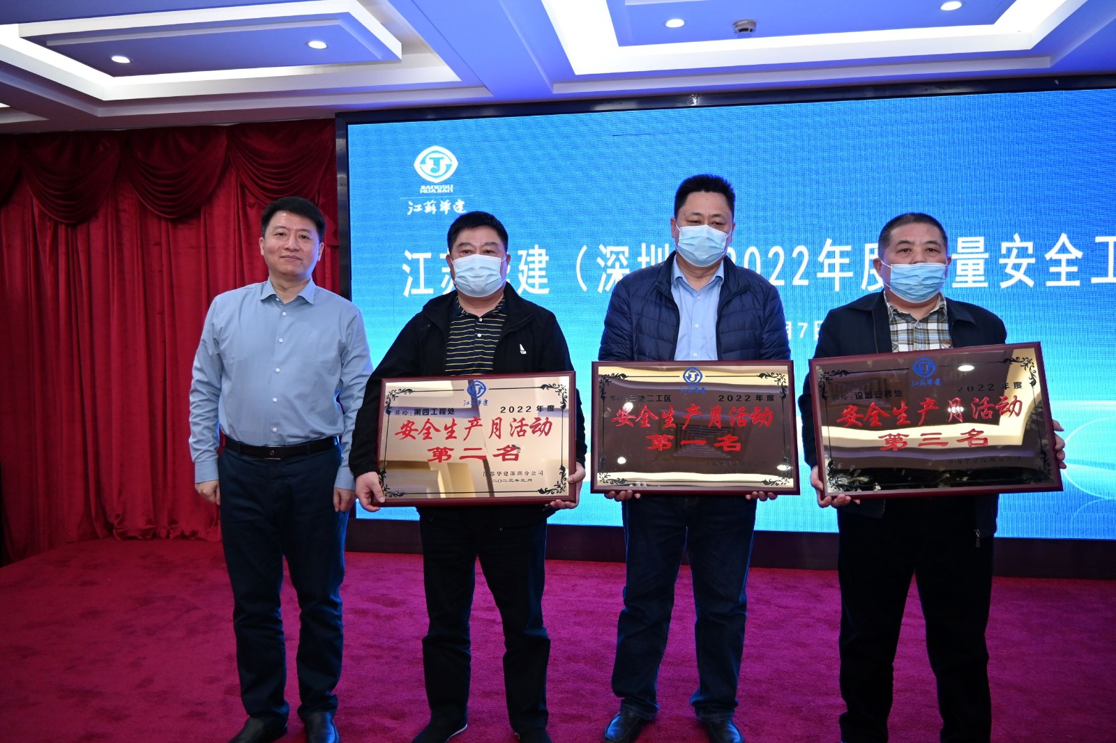 會議表彰了2022年下半年先進(jìn)項目經(jīng)理部、安全生產(chǎn)、文明施工檢查綜合評分前三名和“安全生產(chǎn)月”活動前三名,公司總經(jīng)理吳碧橋為獲獎工程處頒發(fā)了榮譽(yù)獎牌。