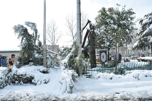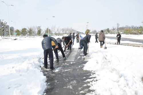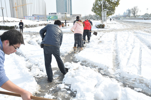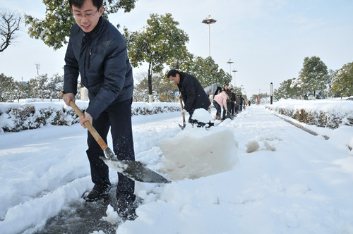 公司總部組織員工上路清掃積雪 時間:2013-02-19 3926 2月18日至19日凌晨,揚州出現低溫降雪災害天氣,降下了多年罕見的一場大雪,壓垮樹枝和部分房屋設施,并造成道路交通不便。19日清晨,公司響應市政府號召,組織20余名員工上路清掃積雪,公司領導吳士茂、錢啟明親自參加,與大家共同會戰2個多小時,完成了清掃任務。 厚重的積雪壓垮樹枝