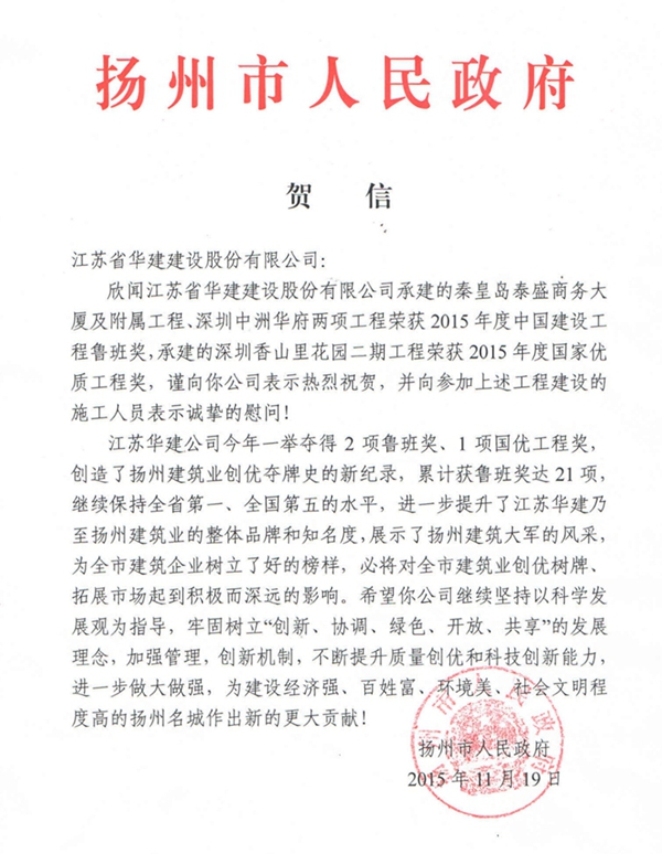 揚州市政府向江蘇華建發(fā)來賀信 祝賀一年內(nèi)獲三項國家質(zhì)量大獎