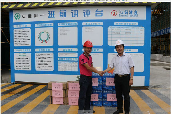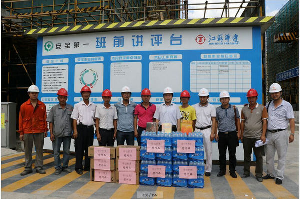 區域公司領導赴三亞工地進行高溫慰問 時間:2015-06-20 3276 6月19日上午,海南分公司黨總支副書記沈巨青帶隊,在分公司工會代表等相關部門陪同下,走訪慰問了三亞婦幼保健院項目部,看望了堅守崗位奮戰在高溫一線的項目部人員,并給他們送去了礦泉水、洗漱用品和防暑藥品。 慰問組一行實地了解項目部的進展情況以及現場人員的食、住、行、業務學習安排等情況,叮囑大家在高溫季節要切實加強現場管理,繃緊安全弦,確保平穩有序生產。
