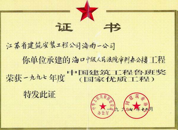 海口市中級(jí)人民法院審判辦公樓位于海口市金宇路8號(hào),1995年4月竣工,1996年6月被評(píng)為海南省優(yōu)質(zhì)工程,并榮獲海南省優(yōu)秀建筑二等獎(jiǎng),1997年12月榮獲魯班獎(jiǎng)。