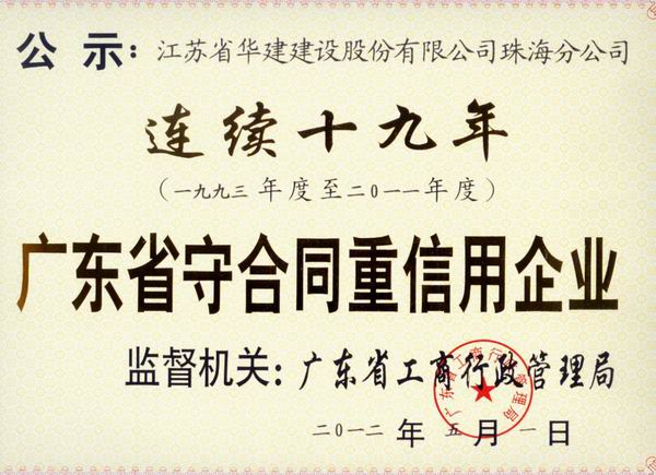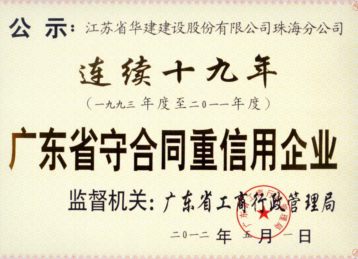 珠海公司連續19年榮獲“廣東省守合同重信用企業”榮譽稱號 時間:2012-06-28 5796 珠海公司連續19年榮獲“廣東省 守合同重信用企業”榮譽稱號 五月份珠海分公司被廣東省工商行政管理局授予“連續十九年廣東省守合同重信用企業”榮譽稱號。