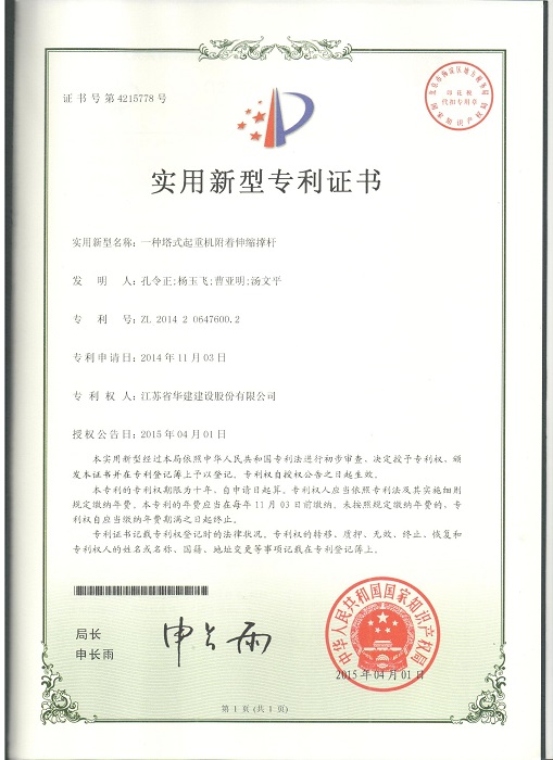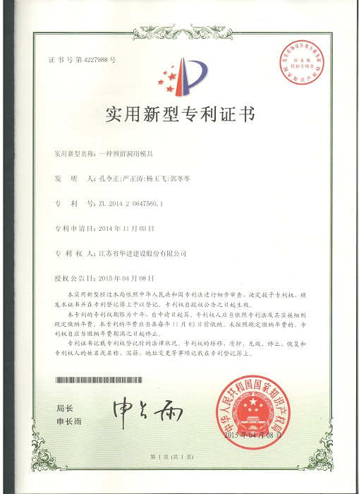 三項(xiàng)實(shí)用新型成果分別是:1、《一種預(yù)留洞用模具》(專利號:ZL201420647560.1,專利權(quán)人:孔令正、嚴(yán)正濤、楊玉飛、郭冬冬);2、《一種型鋼混凝土的模板支撐結(jié)構(gòu)》(專利號:ZL201420647633.7,專利權(quán)人:孔令正、楊玉飛、曹亞明、郭冬冬);3、《一種塔式起重機(jī)附著伸縮撐桿》(專利號:ZL201420647600.2,專利權(quán)人:孔令正、楊玉飛、曹亞明、湯文平)。
