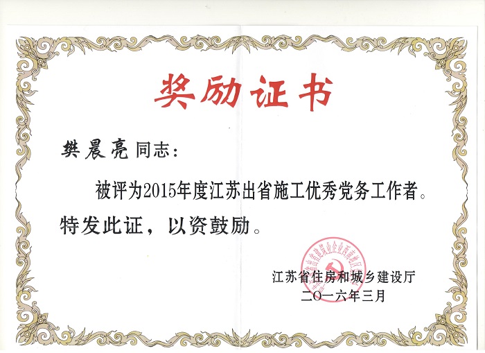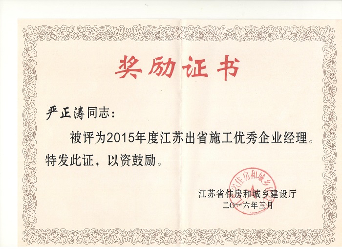重慶分公司被表彰為“2015年度江蘇出省施工先進企業(yè)” 時間:2016-04-20 2964 近日,重慶分公司被江蘇省住房和城鄉(xiāng)建設廳表彰為“2015年度江蘇出省施工先進企業(yè)”,重慶分公司總經(jīng)理嚴正濤榮獲“2015年度江蘇出省施工優(yōu)秀企業(yè)經(jīng)理”稱號,樊晨亮被評為“2015年度出省施工優(yōu)秀黨務工作者”。