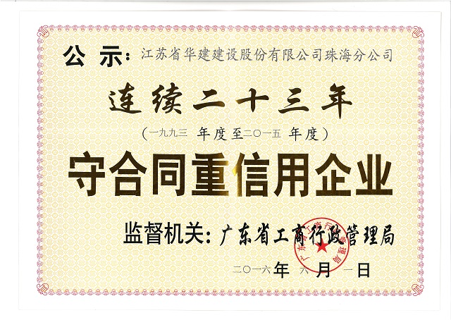 公司連續二十三年被廣東省工商行政管理局表彰為“守合同重信用企業“ 時間:2016-07-21 2899 近日,珠海公司被廣東省工商行政管理局授予“連續二十三年守合同重信用企業”榮譽稱號。 連續二十三年獲得“守合同重信用企業”的榮譽稱號,是政府主管部門和行業的認可和鼓勵,這份榮譽將鞭策珠海公司將誠實守信、合法經營的企業理念一如既往地灌輸到每一個工程建設中去,持續做好企業誠信體系建設,保持自身競爭優勢,樹立守法履約的良好施工企業形象。 目前,珠海公司評選的國家級守合同重信用企業正在公示。