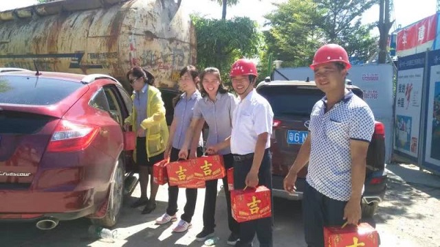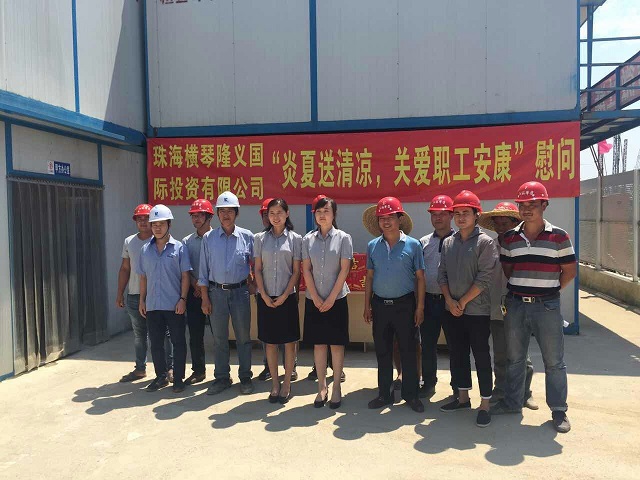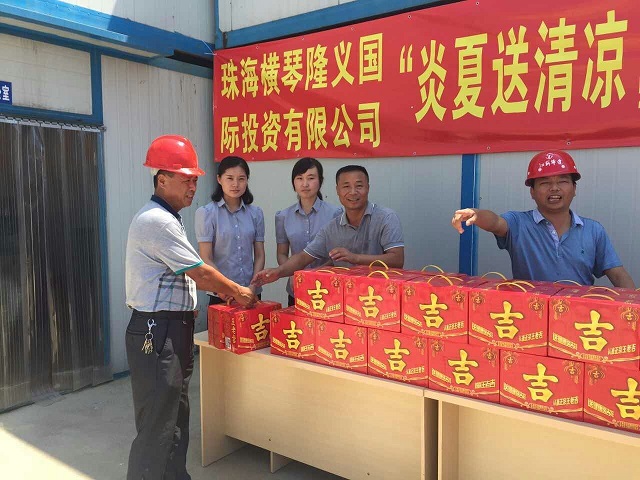 炎炎夏日送清涼 時間:2016-08-01 3815 7月30日上午,珠海分公司橫琴隆義廣場項目部工地熱浪朝天,機聲隆隆,人來人往,一派繁忙景象。一支由江蘇華建直五項目部和橫琴隆義投資公司共同組成的“送清涼”小分隊也在工地上奔忙著,項目經理姚寧與投資公司負責人王艷、許珂等正在將一箱箱王老吉飲料有條不紊地送到建筑工人手中,讓廣大一線職工在炎炎烈日下感受到陣陣清涼。