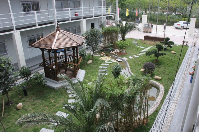 第五項目部負責人陳建表示,在該項目進場之初,就秉承“綠色、環保、節能”的理念,項目部園林景觀的打造全部采用可回收、循環利用的材料?;ㄅ璨捎脧U模板制成,水池循環供水,生活區照明全部采用節能燈,淋浴設施采用空氣能熱水器,空調采用節能產品;并將具有揚州特色的園林景觀融入其中,進行精心布局、合理規劃,將其打造成為工地上的微縮版揚州園林,不僅展示出揚州建筑企業對外的良好形象,更為員工營造一個溫馨舒適的綠色家園。