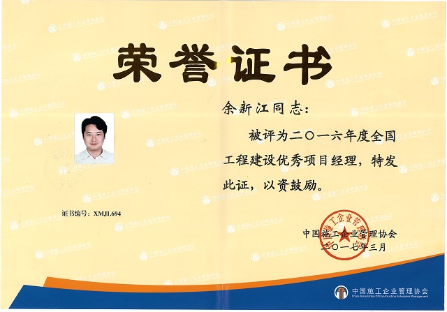 余新江榮獲“2016年度全國工程建設優秀項目經理” 時間:2017-04-24 3310 4月20日 ,中國施工企業管理協會第32次年會在廈門召開。會上,中施企協對全國優秀項目經理進行了表彰,珠海分公司余新江同志被授予“2016年度全國工程建設優秀項目經理”稱號。