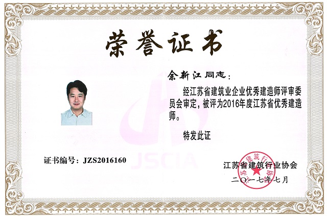 公司1位同志被授予“江蘇省優秀建造師”榮譽稱號 時間:2017-12-12 3914 日前,江蘇省建筑行業協會下發了《關于2016年度江蘇省建筑業優秀建造師的決定》,公司余新江同志位列榜單,榮獲表彰,被授予“江蘇省優秀建造師”榮譽稱號。