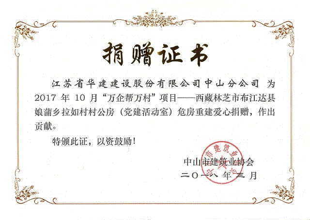 中山分公司在“萬企幫萬村”精準扶貧行動中受表彰 時間:2018-04-18 3170 近日,中山市建筑業協會召開2018年年會暨工程創優表彰大會。會上,協會為去年愛心捐贈支持“萬企幫萬村”扶貧行動——西藏林芝市工布江達縣娘蒲鄉拉如村村公房(黨建活動室)危房重建項目的會員企業頒發了捐贈證書,以表揚捐贈單位的大愛精神,中山分公司受到表彰。