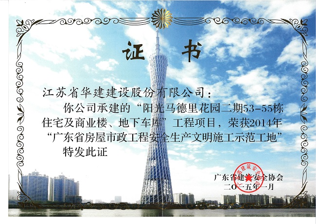 陽光馬德里二期工程榮獲2014年廣東省房屋市政工程安全生產(chǎn)文明施工示范工地