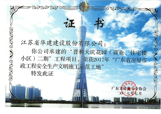 晉和天慶二期獲2017年廣東省建設(shè)工程項(xiàng)目施工安全生產(chǎn)標(biāo)準(zhǔn)化工地