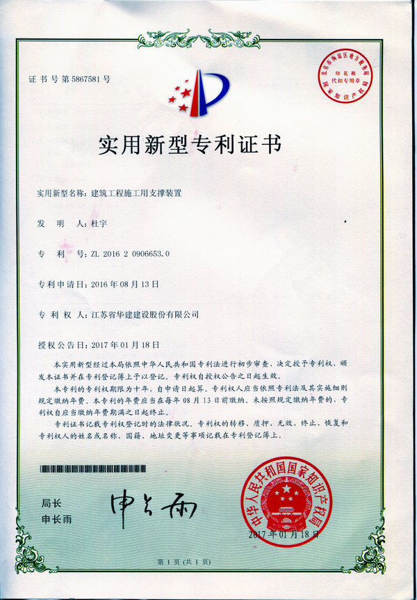 近日,海南分公司《建筑工程施工用支撐裝置》成果獲得國家知識產權局專利授權,被授予國家實用新...