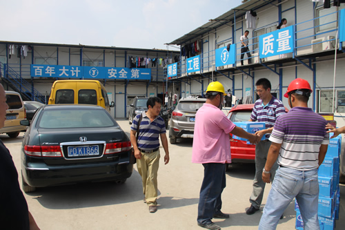 驕陽(yáng)似火,熱浪滾滾,持續(xù)近一個(gè)月的高溫天氣給工程正常施工帶來(lái)了很大的影響,奮戰(zhàn)在烈日炎炎下的一線(xiàn)員工的身體狀況時(shí)刻牽動(dòng)著公司領(lǐng)導(dǎo)的心。7月29日,上海室外溫度更是超過(guò)40度,江蘇華建副總經(jīng)理、上海分公司總經(jīng)理?xiàng)罱芴氐匚锌偣こ處熚捍好鳌⒐?huì)副主席陳德權(quán)等同志赴由公司承建的上海楓葉國(guó)際學(xué)校工地看望一線(xiàn)作業(yè)人員,為員工送去了礦泉水、毛巾等清涼慰問(wèn)品,并叮囑要注意避開(kāi)高溫作業(yè)時(shí)段,保護(hù)身體,確保夏季施工生產(chǎn)安全。