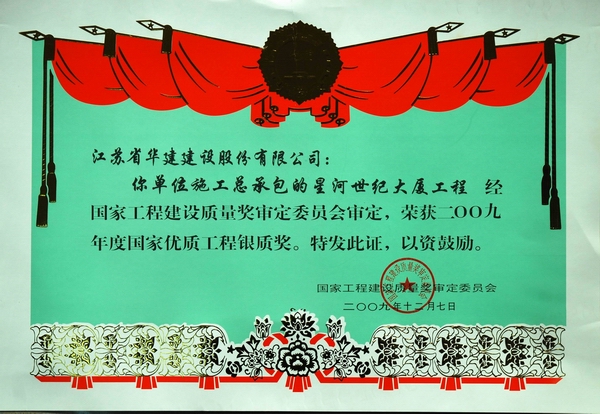 星河世紀大廈 時間:2010-01-19 8456 該工程位于深圳市福田區深南大道南與彩田路西交匯處,是深圳市中心區東門標志性建筑。該工程一裙三塔,32-39層,高173.2米,總建筑面積156680平方米,是集辦公、商業、住宅為一體的綜合樓。 該工程先后榮獲2006年度“深圳市安全生產文明施工優良工地”、2007年度深圳市優質工程“金牛獎”第一名、2007年度廣東省優良樣板工程獎、2007年度江蘇省“揚子杯”省外優質工程獎,2009年12月被評為2009年度國家優質工程銀質獎。