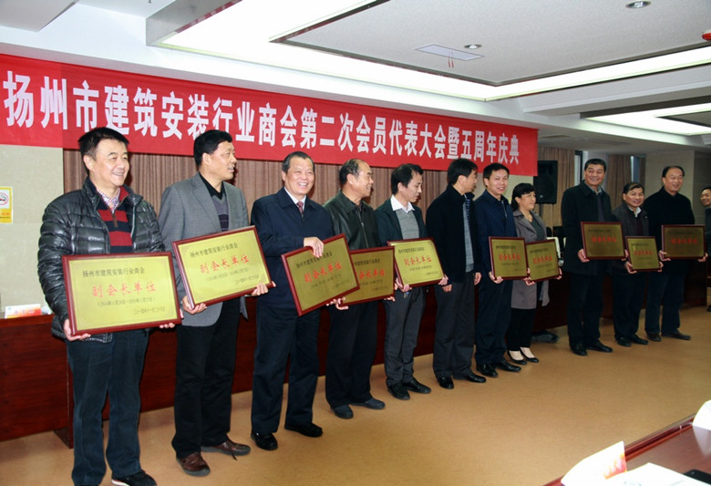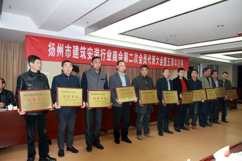 陸金龍主持會員代表大會,第一屆理事會常務副會長吳士茂作了工作報告,吳士茂作為第二次會員代表大會籌備小組負責人還作了關于商會換屆選舉情況的說明。大會通過舉手表決的方式選舉產(chǎn)生了第二屆理事會和理事會領導機構(gòu)。36名理事組成第二屆理事會,陸金龍連任當選第二屆理事會會長,吳士茂任常務副會長,曹德榮等9名同志任副會長。趙振東宣讀了市工商聯(lián)、總商會關于同意揚州市建筑安裝行業(yè)商會換屆選舉結(jié)果的批復。大會舉行了會長單位、副會長單位和理事單位授牌儀式。任壽松代表兄弟友好商會、張紹華代表市民政局分別致賀辭。